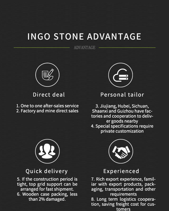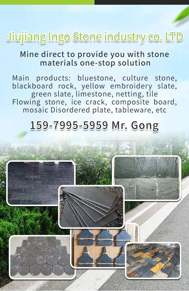 Jiujiang ingshi co., LTD., located at the foot of the beautiful lushan mountain, is a stone production, processing, sales and export trade as one of the stone enterprises. The company began to do SLATE production from the 1990s, focus on doing SLATE stone for 30 years. Company established in recent years, in hubei, shaanxi, guizhou branch, sign the agency agreement with the sichuan SLATE processing plants, can arrange delivery to the nearest, cost savings for customers, the factory has a set of advanced production equipment, can be made private specifications SLATE stone material, can finish the production task, with good quality for the general customers friends to provide one-stop SLATE stone materials solution. The company's main products are: blue SLATE, culture stone, blackboard rock, yellow rust SLATE, green SLATE, grey SLATE, net, tile, water stone, ice crack, composite plate, Mosaic, random plate, cup mat dish handicraft and so on. The company adheres to the principle of &q